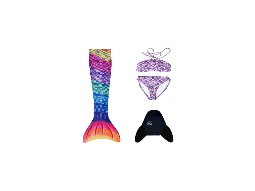 Set kostým mořská panna RAINBOW -kostým + dvojdílné plavky+mono ploutev-dětská XS(122/128)